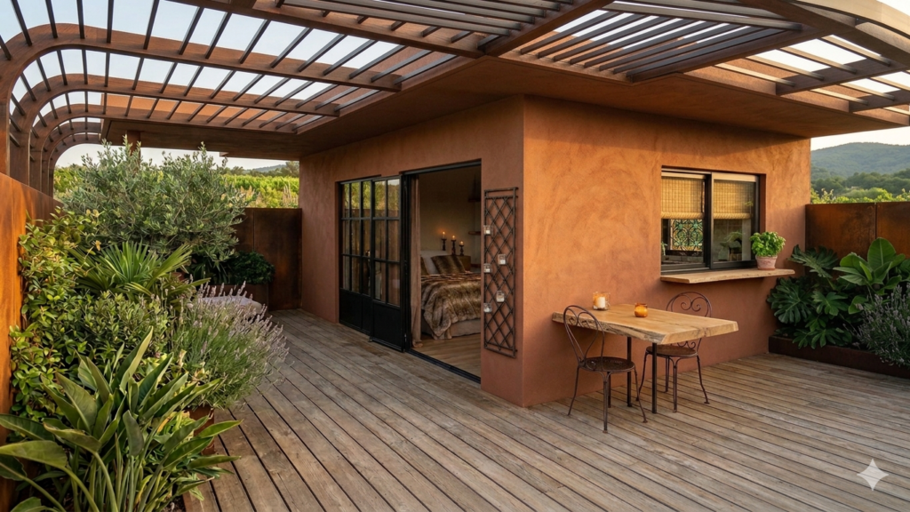 Dans cette continuité, je développe une gamme de mobilier extérieur en acier corten, pensée pour créer de véritables lieux de vie autour de pièces fortes comme le brasero.